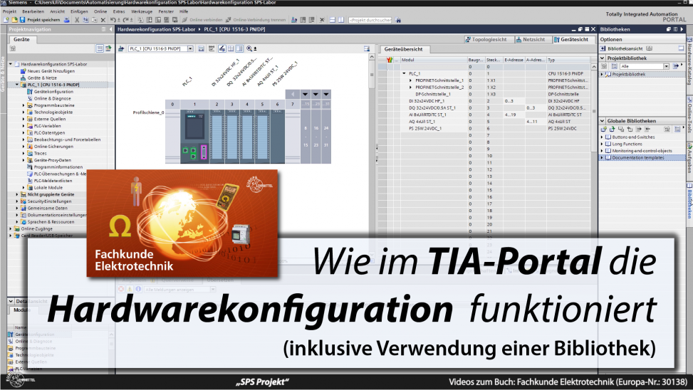 SPS-Tutorial: Hier lernst Du, wie man ein neues Projekt anlegt, wie die Hardwarekonfiguration im TIA-Portal funktioniert und wie man diese in einer Bibliothek abspeichert. Als Beispiel wird eine Siemens Simatic S7 1500 verwendet.